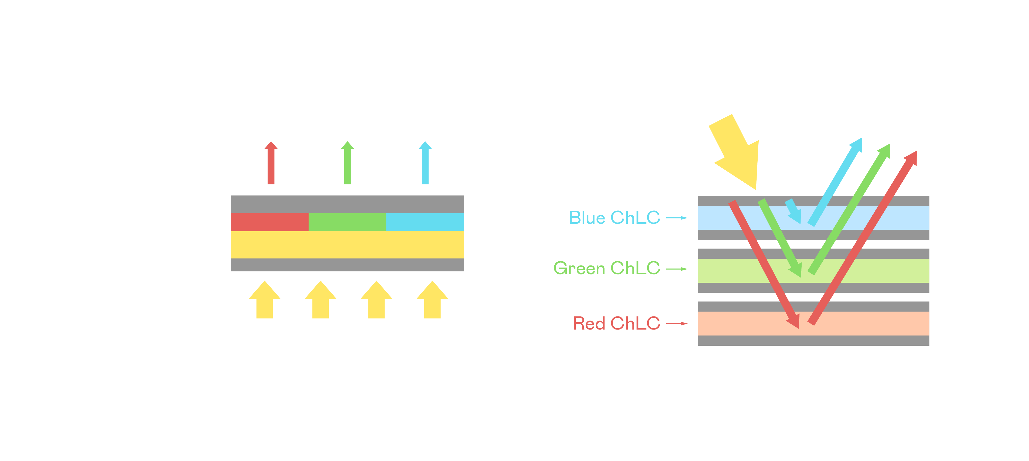 pg电子胆固醇液晶显示器是由红、绿、蓝三层胆固醇液晶面板堆叠而成,并采用无彩色滤光片设计,减少环境光在反射过程中的损耗。
